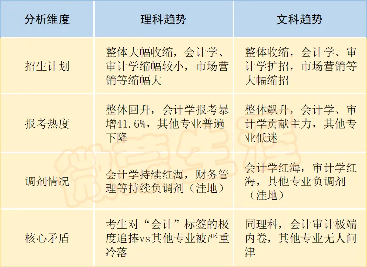 文科数据呈现出与理科高度相似的图景:整体报考人数大幅增长,调剂由负转正,但热度高度集中于会计学和审计学。会计学、审计学持续正调剂,竞争激烈;而市场营销、工商管理、财务管理等专业则持续负调剂,成为价值洼地。