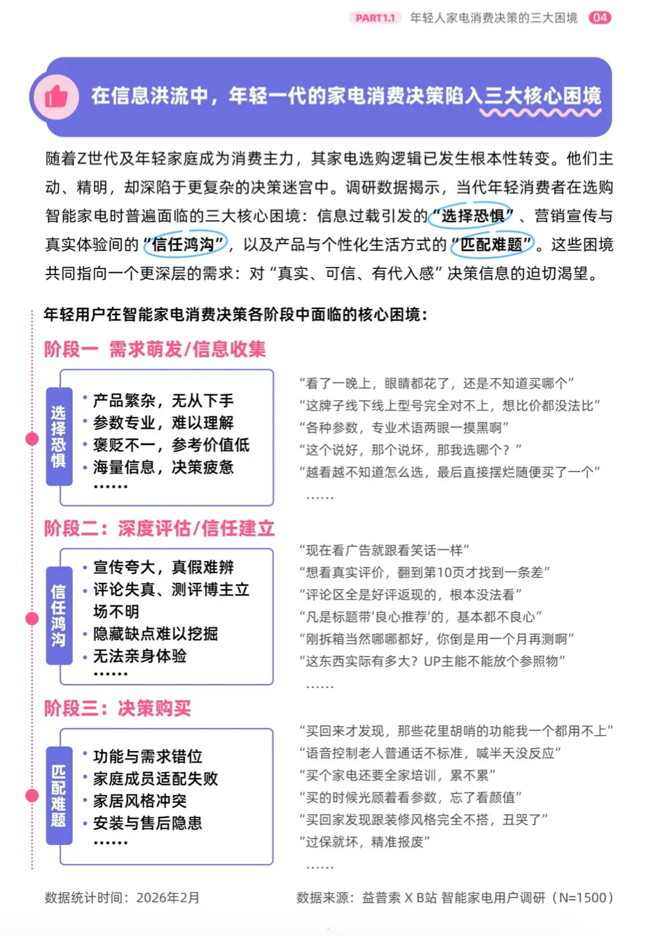 年轻家庭成为#智能家电 的决策主力,其选购逻辑已发生根本性转变:他们主动、精明,追求品质与个性,却也在参 数迷雾、信任鸿沟与匹配难题中,陷入前所未有的决策困境。