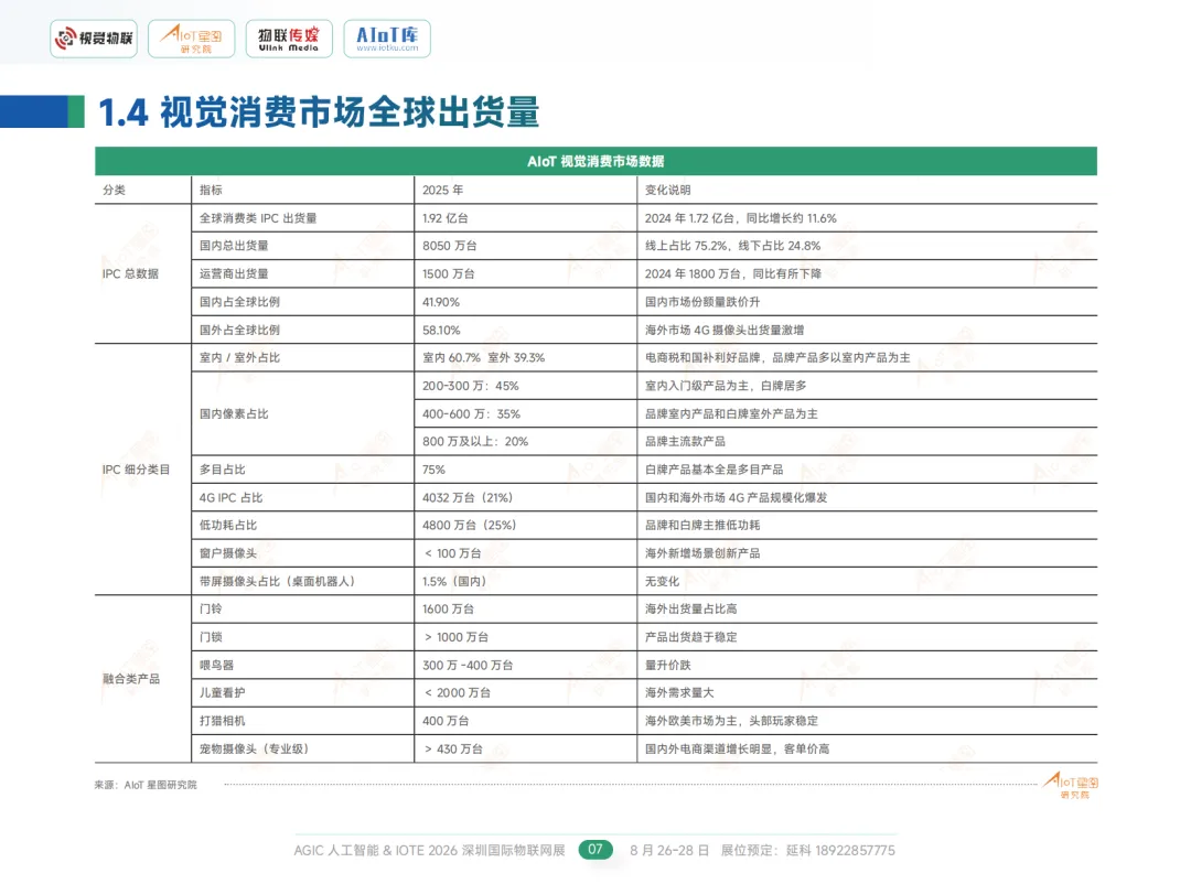 《2026年AIoT视觉消费市场调研报告》对2025年市场进行了深度复盘,并给出了对2026年的明确预判。以下梳理了其中的核心洞察与关键结论,帮助你快速把握报告精华: