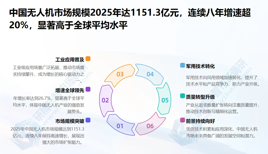北京研精毕智市场调研数据显示,中国无人机市场规模已连续八年保持20%以上的高速增长,2025年整体市场规模达1151.3亿元,较2024年增长26.7%,增速较全球平均水平高出8.3个百分点。其中,民用无人机市场规模占比74.6%,达858.9亿元;军用无人机市场规模292.4亿元,占比25.4%。从增长动力来看,民用领域的工业级应用与军用技术民用化成为两大核心推手,政策端低空开放进程加速与技术端智能化升级形成双重赋能,推动市场从“量的增长”向“质的提升”转型。北京研精毕智研究报告指出,2026年作为低空经济“常态运营”元年,随着《民用无人驾驶航空器系统运行识别规范》等国家标准的落地实施,市场规范化程度将显著提升,预计全年市场规模将达1456.8亿元,其中工业级无人机占比将首次超过60%,成为绝对主导细分赛道。