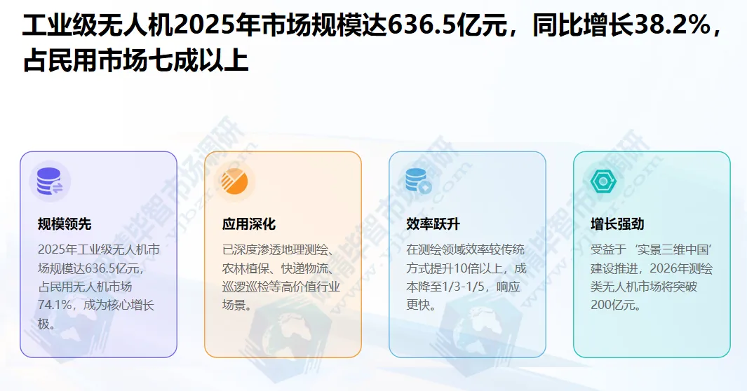 工业级无人机:凭借高效、安全、低成本的作业优势,已深度渗透至地理测绘、农林植保、快递物流、巡逻巡检等多个领域。北京研精毕智研究报告数据显示,2025年工业级无人机市场规模达636.5亿元,同比增长38.2%,占民用无人机市场的74.1%。其中,地理测绘与农林植保是当前最成熟的应用场景,合计市场占比超50%;快递物流与巡逻巡检增速最快,2025年增速分别达42%和39.5%,成为新的增长极。在地理测绘领域,无人机凭借厘米级精度、低成本优势,推动行业进入“实时化、智能化、平民化”新阶段,效率较传统航测提升10倍以上,成本仅为传统方式的1/3-1/5,应急响应时间从数天缩短至数小时。北京研精毕智研究报告预测,随着“实景三维中国”建设的推进,2026年测绘类无人机市场规模将突破200亿元,年复合增速维持在35%以上。
