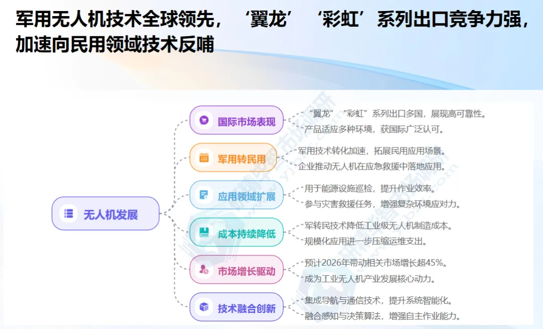 军用无人机:技术已处于全球领先水平,“翼龙”“彩虹”等系列产品在国际市场具备较强竞争力。2025年军用无人机市场规模达292.4亿元,同比增长18.6%,主要需求来自国防现代化建设与边境安防。北京研精毕智市场调研发现,近年来军用无人机企业加速民用化转型,一方面通过技术下放降低工业级无人机成本,另一方面借助多元化战略对冲军贸风险,航天时代飞鹏、四川腾盾等企业已在物流、巡检等领域实现突破。本研究报告预测,2026年军用技术民用化将带动相关市场规模增长45%以上,成为工业级无人机市场的重要增长动力。