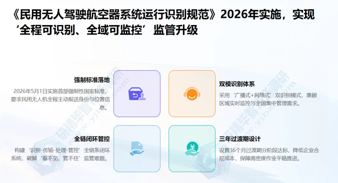 近年来,国家将低空经济列为战略性新兴产业,各省市密集推进低空空域改革与配套政策落地,构建起“国家战略引导、地方细则支撑、标准体系保障”的全方位政策框架。核心监管方面,低空经济首个强制性国家标准《民用无人驾驶航空器系统运行识别规范》将于2026年5月1日正式实施,标志着无人机监管迈入“全程可识别、全域可监控”阶段。北京研精毕智研究报告解读指出,《规范》要求民用无人机全程主动报送身份、位置等核心信息,采用“广播式+网络式”双识别模式,分别满足区域实时监控与全国集中管理需求,构建“识别-传输-处理-管控”全链条闭环。政策设置36个月过渡期,分阶段推进达标要求,既破解“看不见、管不住”的行业痛点,又通过统一标准降低企业合规成本,为高密度低空作业提供制度保障。