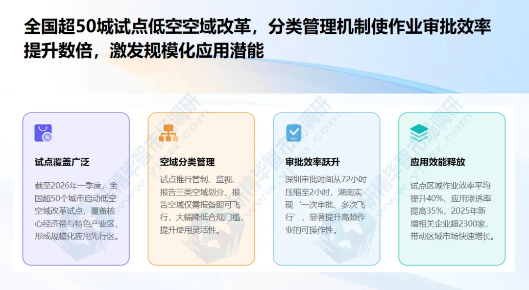 空域改革是产业发展核心前提。北京研精毕智调研报告显示,截至2026年一季度,全国超50个城市启动低空空域改革试点,覆盖核心经济带与特色产业区域。试点城市建立“分类划设、动态管理、简化审批”机制,将空域划分为管制、监视、报告三类,报告空域仅需提前报备即可飞行。例如深圳300米以下低空设多个报告空域,审批时间从72小时压缩至2小时;湖南实现“一次审批、多次飞行”,满足高频作业需求。北京研精毕智市场调研数据显示,试点区域无人机作业效率平均提升40%,应用渗透率提高35%,2025年试点城市新增相关企业超2300家,带动区域市场规模增长52%,政策“放管结合”为规模化应用提供关键保障。