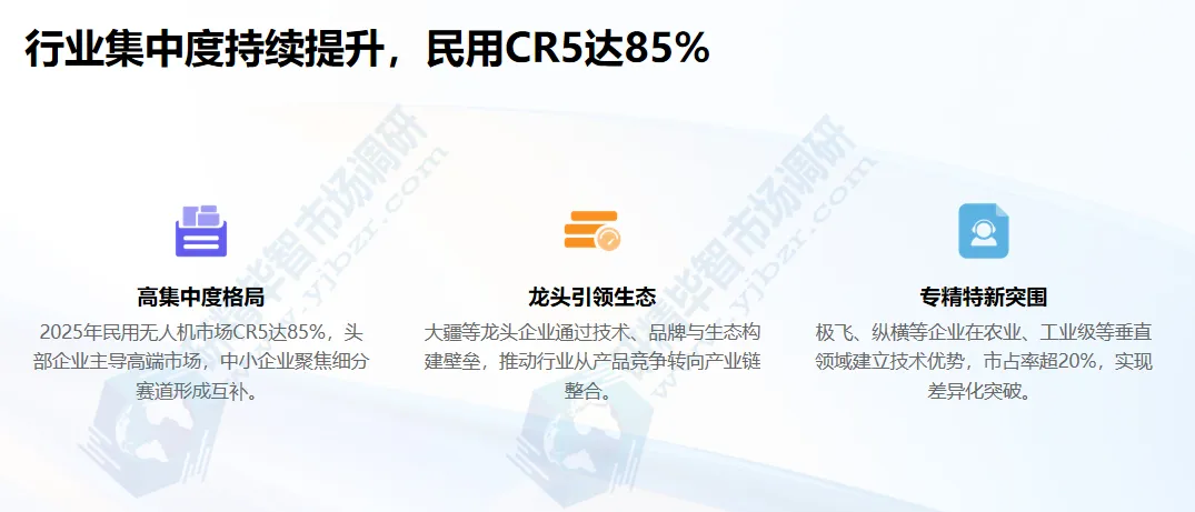中国无人机市场已形成“头部企业主导高端市场、中小企业聚焦细分赛道”的稳定竞争格局,行业集中度持续提升,差异化竞争特征显著。北京研精毕智研究报告数据显示,2025年民用无人机市场CR5(前5家企业市场份额)达85%,军用无人机市场CR3达78%,高端市场呈现“一家独大、寡头竞争”态势,而中低端市场与细分场景则涌现出一批特色企业。