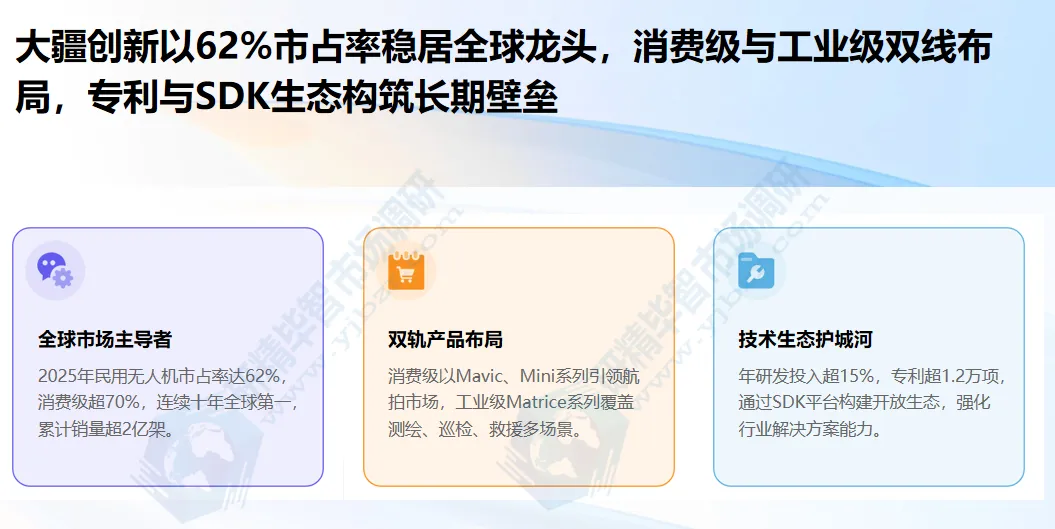 大疆创新:是全球无人机行业绝对龙头,2025年民用无人机市场市占率达62%,连续十年全球第一,消费级市场份额超70%,形成绝对竞争优势。北京研精毕智市场调研显示,大疆覆盖消费级与工业级全赛道:消费级领域以“极致性价比+易用性”筑壁垒,Mavic、Mini、Air系列覆盖中高端市场,ActiveTrack智能跟随算法、4K/8K超高清航拍技术成行业标杆,全球累计销量超2亿架,用户满意度92%;工业级领域聚焦测绘、巡检、安防等场景,2019年测绘市场市占率24.2%,Matrice系列具备强抗干扰与灵活载荷扩展能力,适配多类设备,应用于电力巡检、应急救援等多场景。大疆每年研发投入占营收超15%,累计专利超1.2万项,核心领域全球领先。北京研精毕智信息咨询调研报告指出,其正通过SDK工具包、行业解决方案平台构建开放生态,吸引合作伙伴拓展应用场景,巩固市场主导地位。