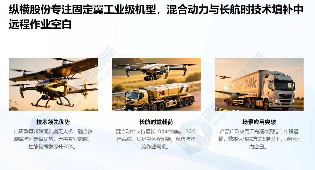 纵横股份:专注工业级固定翼无人机,2025年市场市占率6.3%,细分赛道排名第一。核心竞争力在于自研垂直起降固定翼无人机,融合多旋翼与固定翼优势,无需专业跑道,续航最长10小时、载重30公斤,性能较同类型产品提升30%,满足中远程、长时间作业需求。北京研精毕智研究报告指出,其混合动力技术行业领先,解决传统固定翼痛点,产品广泛应用于测绘、巡检、物流等领域:测绘实现厘米级精度数据采集,效率较传统航测提升5倍;物流可完成500公里以上中远程运输,填补运力空白。公司为工业级无人机“专精特新”标杆,客户覆盖政府、央企等优质群体,市场认可度持续提升。