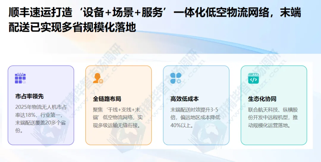 顺丰速运:依托物流场景优势布局无人机领域,2025年物流无人机市占率18%,行业第一,是“设备+场景+服务”一体化模式代表。聚焦“干线+支线+末端”全链路低空物流网络,末端配送无人机已在20多个省份规模化应用,覆盖偏远区域,解决“最后一公里”难题。北京研精毕智市场调研数据显示,顺丰末端配送无人机配送半径5-15公里,载重5公斤,时效较传统快递提升3-5倍,偏远地区配送成本降低40%以上。干线与支线领域,与航天科技、纵横股份合作推出中远程无人机,实现100-500公里运输。北京研精毕智研究报告预测,2024-2029年中国物流无人机市场规模将从330亿元增至1920亿元,年复合增速42%,顺丰有望持续领跑,推动低空物流规模化运营。