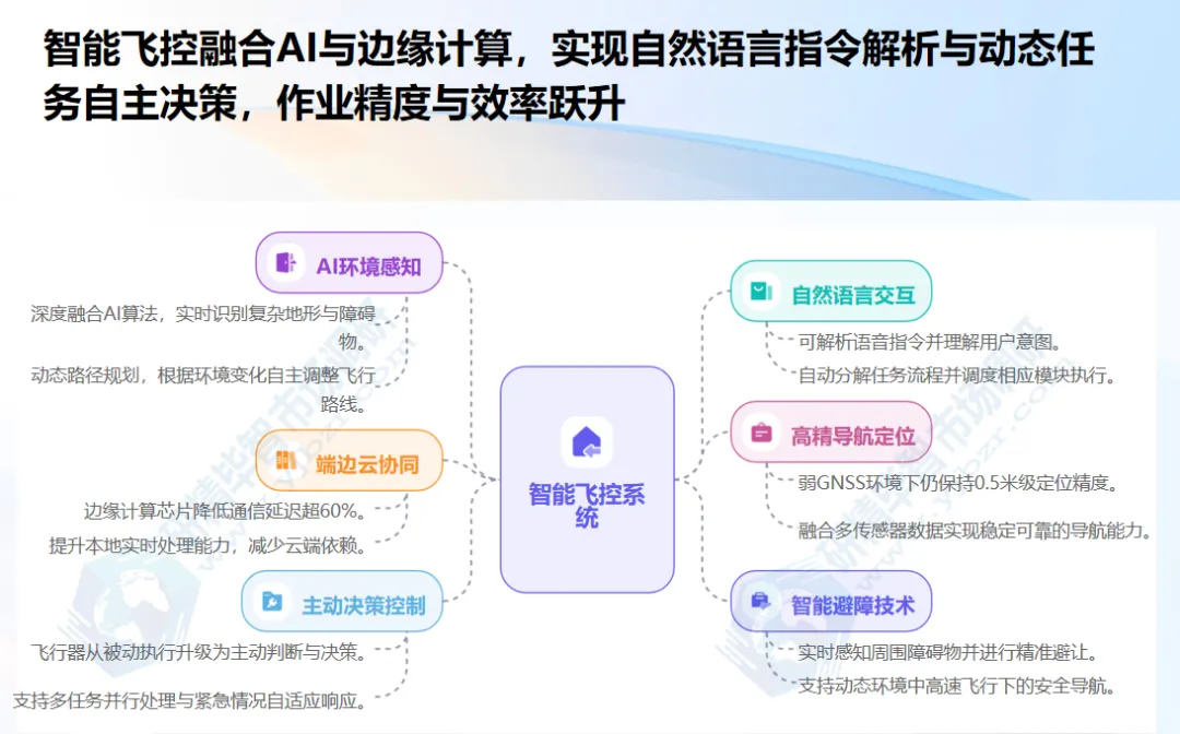 智能飞控与自主决策:飞控系统作为无人机的“大脑”,正实现从“被动执行”到“主动决策”的根本性升级。北京研精毕智研究报告显示,新一代智能飞控深度融合计算机视觉、SLAM、AI算法,具备复杂环境理解与动态任务规划能力。例如大疆FlightAutonomy6.0系统,搭载32TOPS算力的AI芯片,支持自然语言指令解析,可将抽象作业任务自动分解为精准执行方案,在GNSS信号受限场景中仍能实现0.5米精度导航避障。边缘计算芯片的普及推动“端-边-云”协同架构落地,无人机本地完成感知决策,通信延迟降低60%以上。北京研精毕智市场调研发现,2025年智能无人机市场占比达38%,预计2026年突破50%,在电力巡检等场景缺陷识别准确率超98.5%,作业效率较传统机型提升3-5倍。