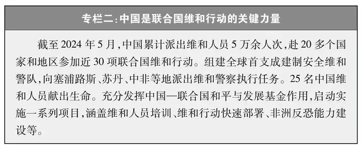 坚定支持联合国提高维和行动履行授权能力。中国是联合国第二大会费国、第二大维和摊款国,也是安理会常任理事国第一大维和行动出兵出警国。支持联合国在国际反恐斗争中发挥中心协调作用,在全球数字治理和规则制定方面发挥主导作用,支持世卫组织在全球卫生事务中发挥领导协调作用,支持联合国教科文组织推动全球教育、科技、文化发展,促进文明交流互鉴、包容合作。