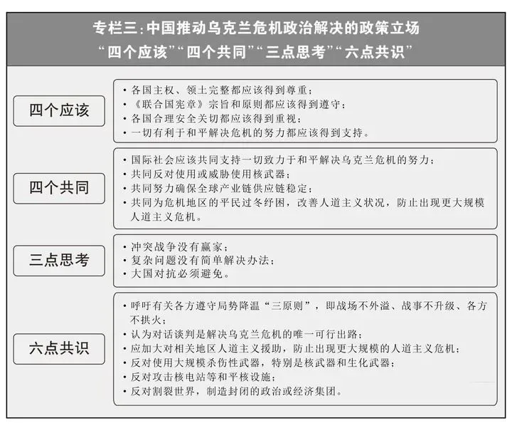 在乌克兰问题上,恪守客观公正,积极劝和促谈,提出“四个应该”、“四个共同”、“三点思考”,发布《关于政治解决乌克兰危机的中国立场》,同巴西联合发布“六点共识”,会同“全球南方”国家发起“和平之友”小组,坚决维护“核战争打不赢也打不得”共识,积极推动落实《五个核武器国家领导人关于防止核战争与避免军备竞赛的联合声明》,为防止乌克兰危机升级为核冲突发挥重要作用。中方支持一切致力于和平的努力,同时认为所有当事方和利益攸关方都应适时参与到和谈进程中。