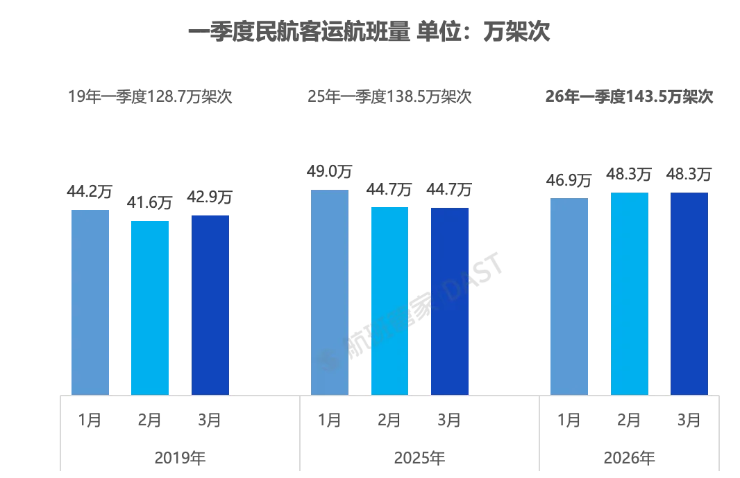 2026年一季度民航客运航班总量为143.5万架次(1-3月份客运航班量分别为46.9万、48.3万和48.3万架次);同比2025年增长3.6%(其中国内增长3.6%、国际/地区增长3.8%),同比2019年同期增长11.5%(其中国内增长16.8%、国际/地区下降12.4%)。