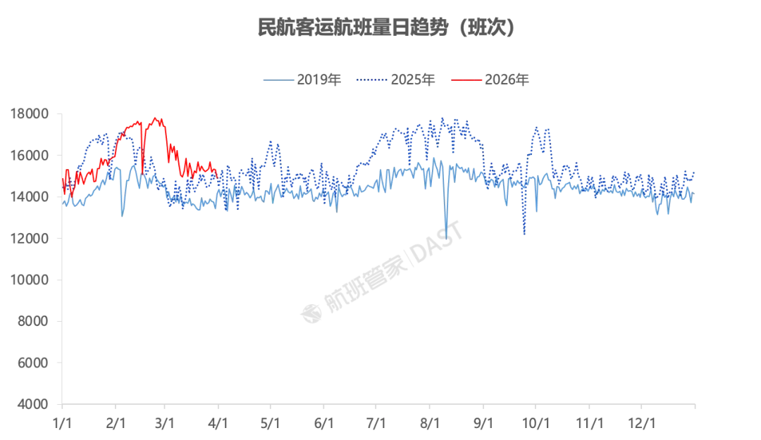 2026年一季度(1-3月)包括春节与春运部分周期,整体航班量处于高位运行,整体趋势与历年保持一致,整个一季度日均航班量达1.59万班次。