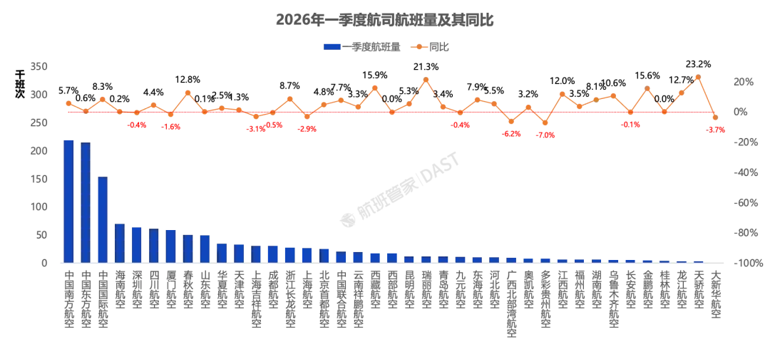 2026年一季度国内客运承运航司39家(按二字码统计,幸福航空停航、重庆航数据计入南航),执飞客运航班总量达136.5万班次,同比增长3.3%。39家航司中29家同比正增长,TOP20航司中,藏航+15.9%、春秋航+12.8%、长龙航+8.7%、国航+8.3%等航司增幅靠前;10家航司同比负增长,TOP20航司中,吉祥航-3.1%、上航-2.9%、厦航-1.6%。