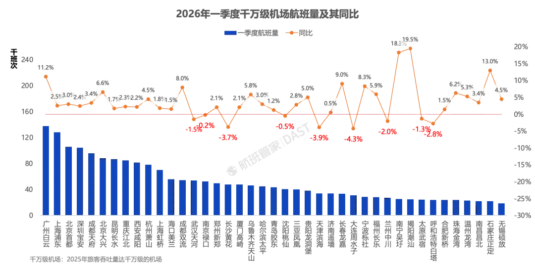 2026年一季度41座千万级机场(2025年吞吐量达千万级机场)客运起降213.1万架次,同比增长3.4%。41座机场中,32座机场同比正增长,其中揭阳潮汕+19.5%、南宁吴圩+18.3%、石家庄正定+13.0%、广州白云+11.2%等机场增幅靠前;9座机场同比负增长,其中大连周水子-4.3%、天津滨海-3.9%、长沙黄花-3.7%。