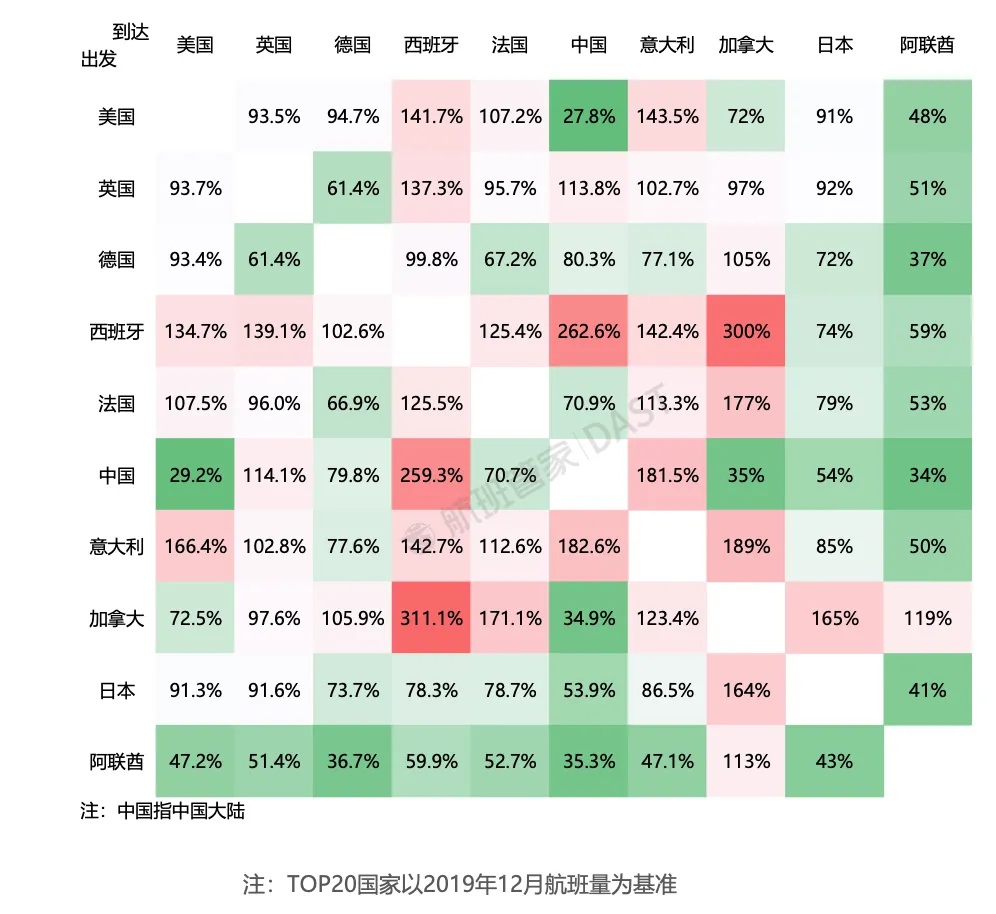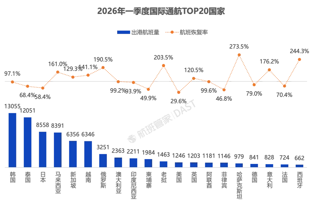2026年一季度出港通航国家中,韩国、泰国、日本位列前三,三者皆未恢复至2019年水平,泰国及日本下滑明显,前者不足2019年的7成,后者不足6成;TOP20中马来西亚、新加坡、越南、俄罗斯、老挝、英国、哈萨克斯坦、意大利、西班牙等9国航班超过2019年水平,美国航班恢复率仍处于较低水平,仅29.6%。