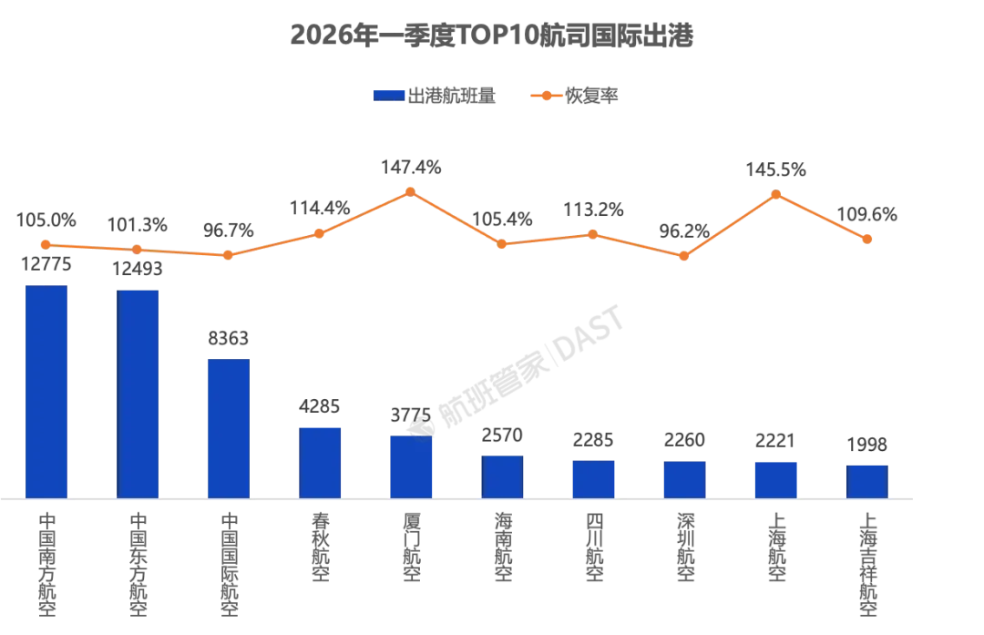 2026年一季度境内航司国际航班整体超2019年,恢复率达105.5%。TOP10中8家航司恢复并超过2019年,其中厦航恢复率最高,达147.4%,其次是上航145.5%,三大航国际恢复率分别为:南航105%、东航101.3%、国航96.7%。