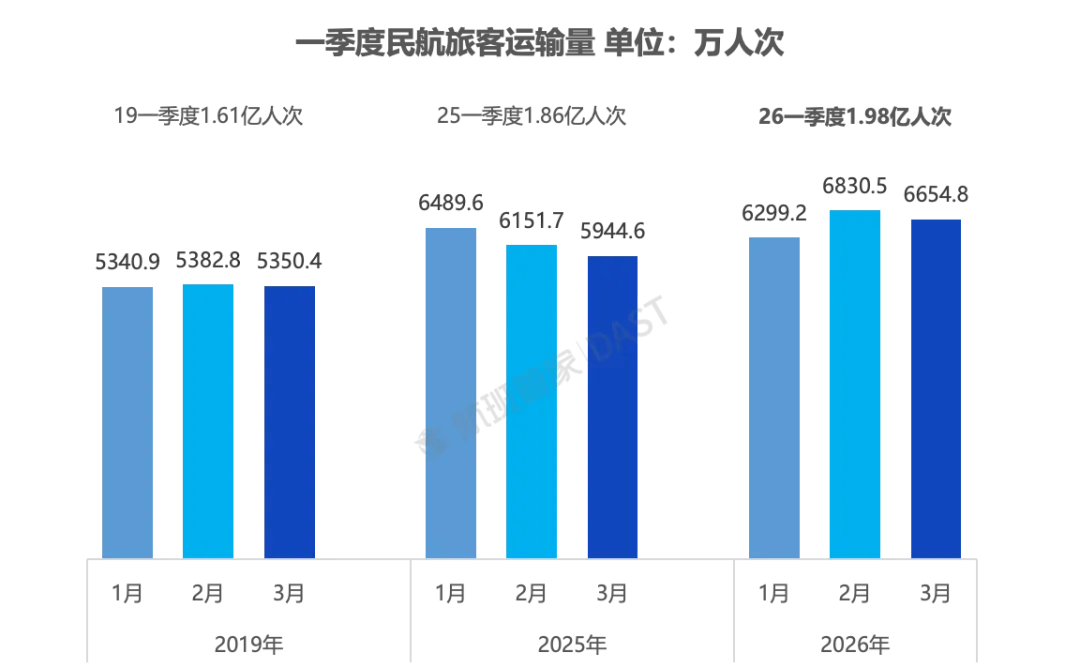 2026年一季度民航旅客运输总量为1.98亿人次(1-3月分别为6299.2万、6830.5万和6654.8万人次);整体同比2025年增长6.4%,同比2019年增长23.1%;国内旅客运输量1.75亿人次,同比2025年增长6.0%、同比2019年增长25.0%;国际地区旅客运输量0.23亿人次,同比2025年增长10.1%、同比2019年增长10.4%。