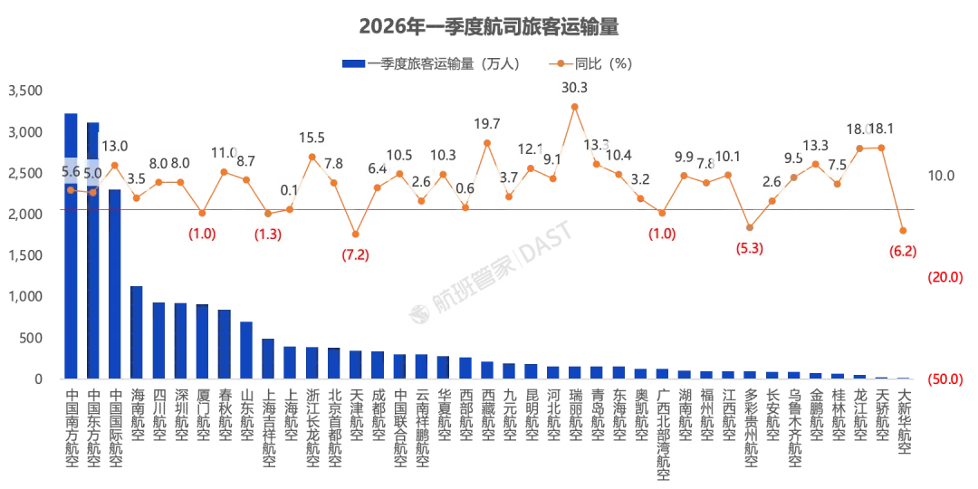 2026年一季度航司旅客运输量排名前三位的航司分别为:南航、东航和国航,旅客运输量分别达3224.5万、3116.8万、2298.3万,三大航占民航整体的43.7%;39家航司中,33家航司旅客运输量同比正增长,头部航司中国航+13.0%、春秋航+11.0%等航司增幅较大;6家航司同比负增长,其中天航-7.2%降幅最大。