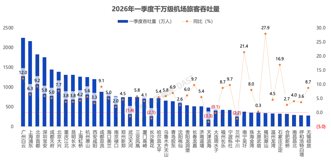 2026年一季度41座千万级机场(2025年吞吐量达千万级)旅客吞吐量共计3.3亿人次,同比增长5.8%。41座机场中36座同比正增长,其中揭阳潮汕+27.9%、南宁吴圩+21.4%、石家庄正定+16.9%、广州白云+12.0%等机场增幅靠前;5座机场负增长,天津滨海、兰州中川、长沙黄花、武汉天河等机场有不同程度的下滑。
