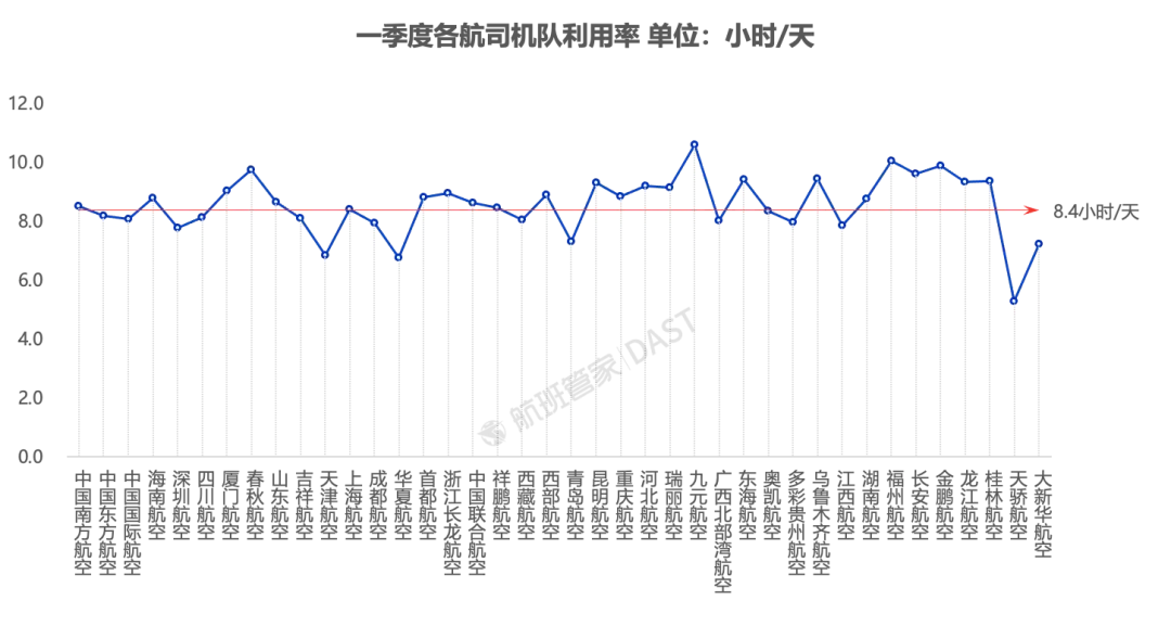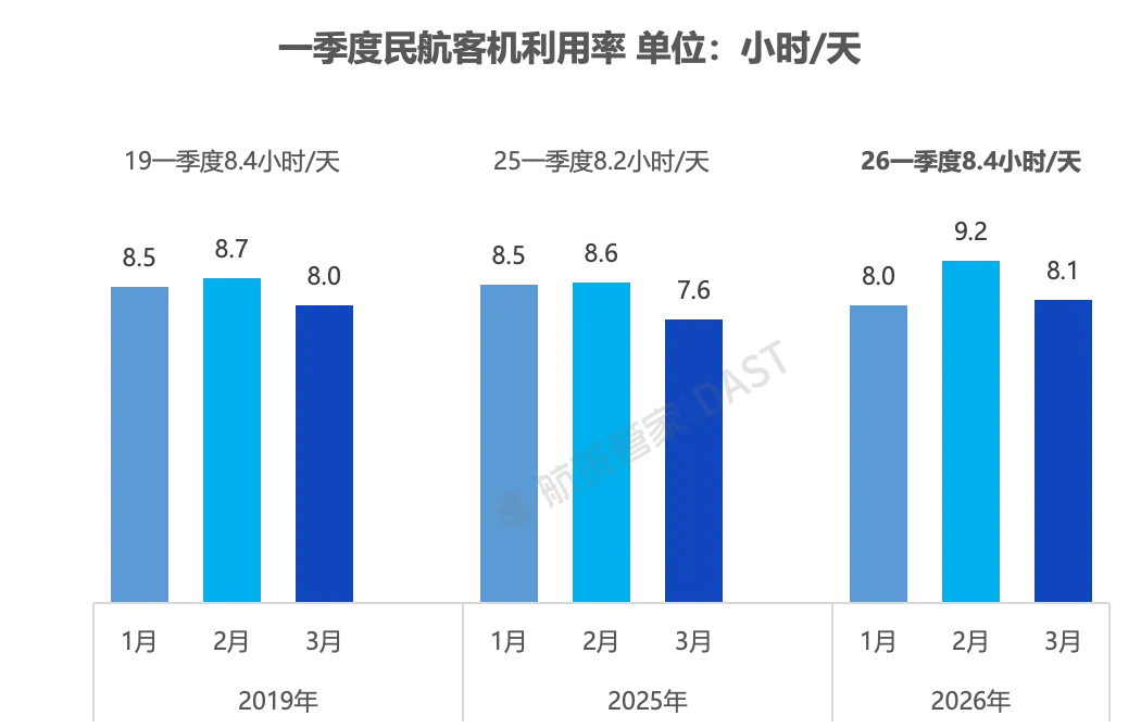 2026年一季度民航平均机队利用率达小时8.4小时/天(仅空中时长,不含滑行时长),同比微增0.2小时/天,其中1-3月飞机日利用率分别为8.0、9.2和8.1小时/天。