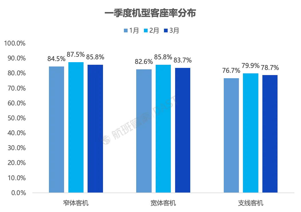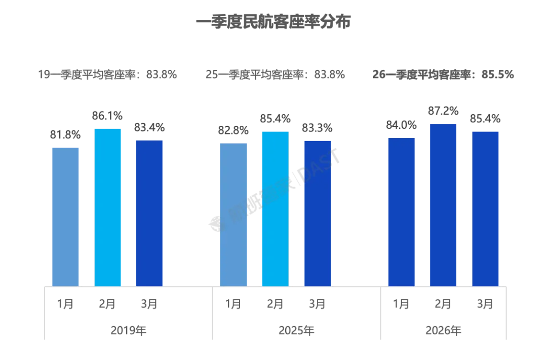 2026年一季度民航整体客座率达85.5%,1-3月正班客座率分别为84%、87.2%和85.4%。整体环比微降0.2个百分点,同比增长1.7个百分点,同比2019年增长1.8个百分点。