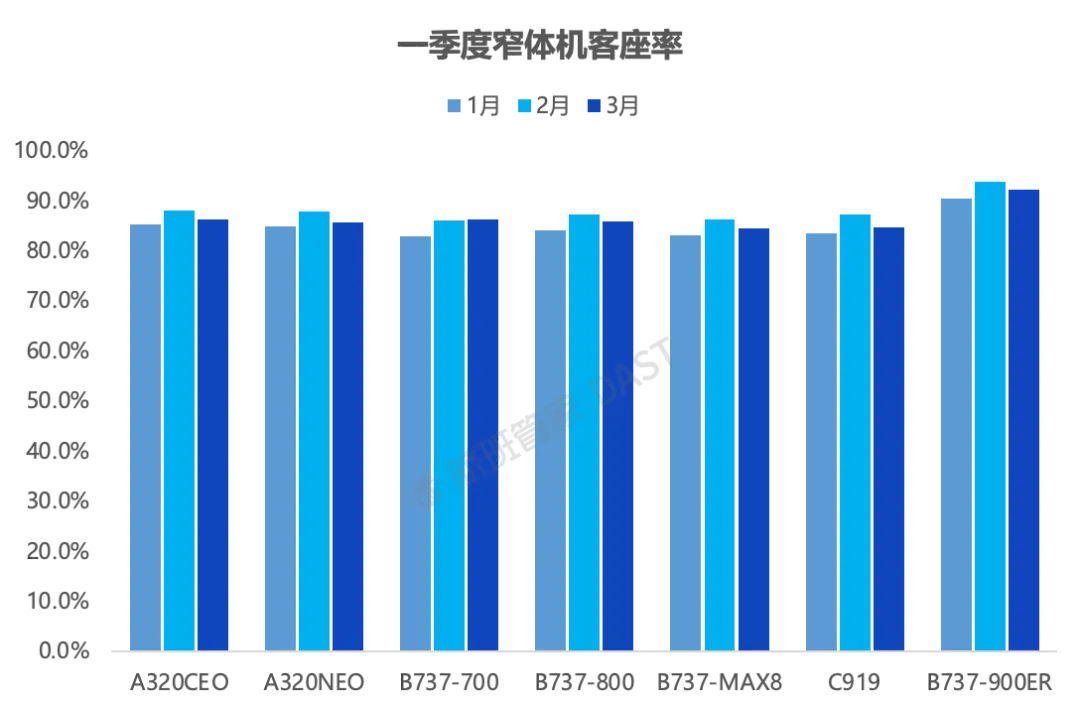 2026年一季度,窄体机中,B737-900ER机型的平均客座率最高,达到了92.1%,国产客机C919机型平均客座率达85.0%。