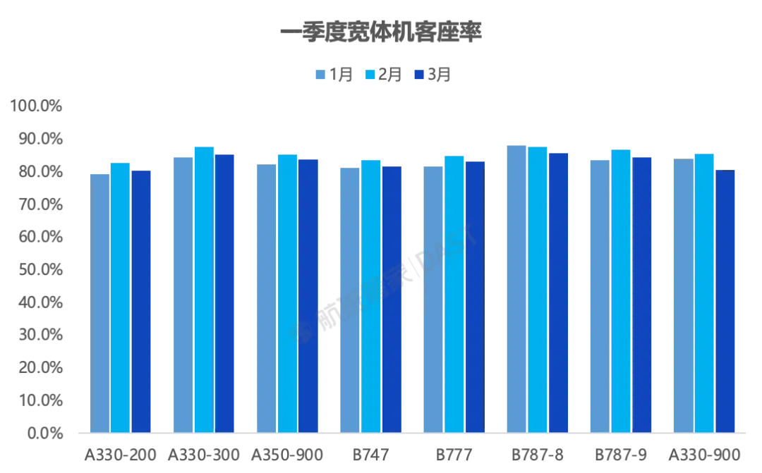 2026年一季度,宽体机中,B787-8机型的平均客座率最高,达到了87.2%,A330-200机型平均客座率最低,达80.7%。
