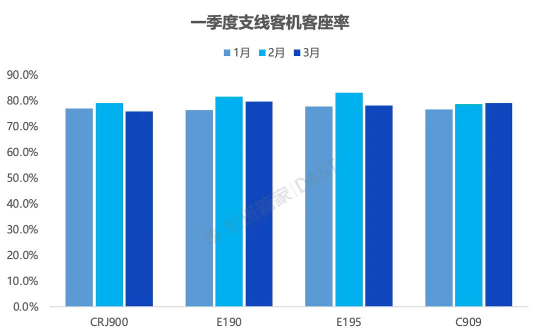 2026年一季度,支线客机客座率E195最高,达79.8%,其它机型分别为:CRJ900 77.3%、E190 79.3%、C909 78.1%。