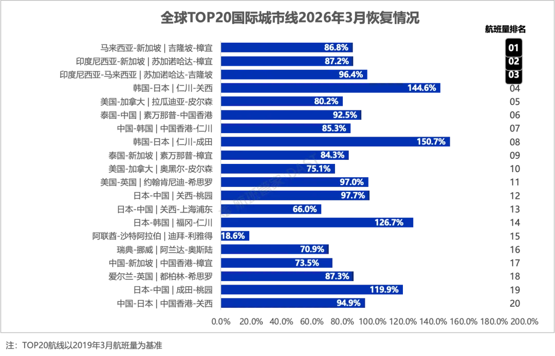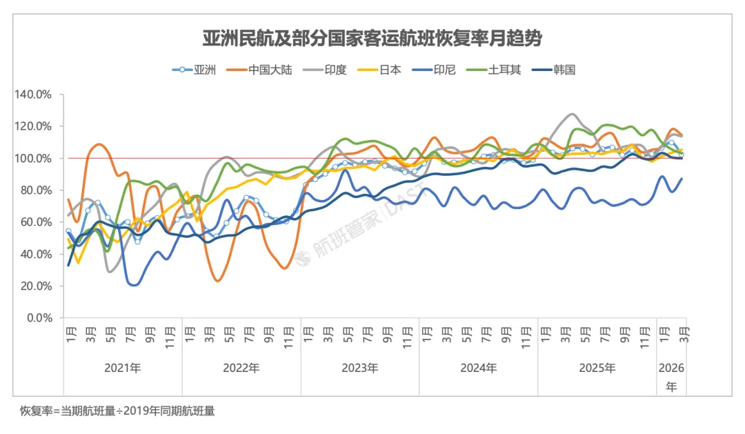 2026年3月,亚洲民航市场恢复至2019年同期的102.4%