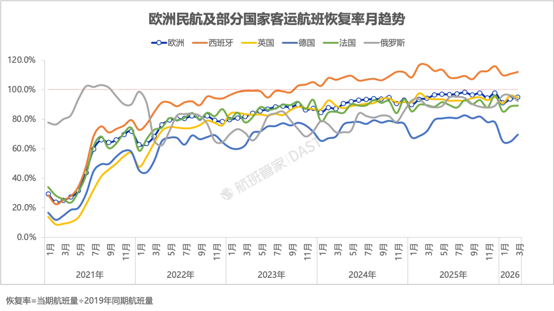 2026年3月,欧洲民航市场恢复至2019年同期的94.9%