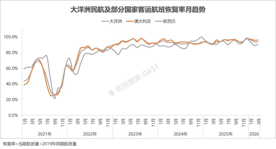 2026年3月,大洋洲民航市场恢复至2019年同期的93.6%