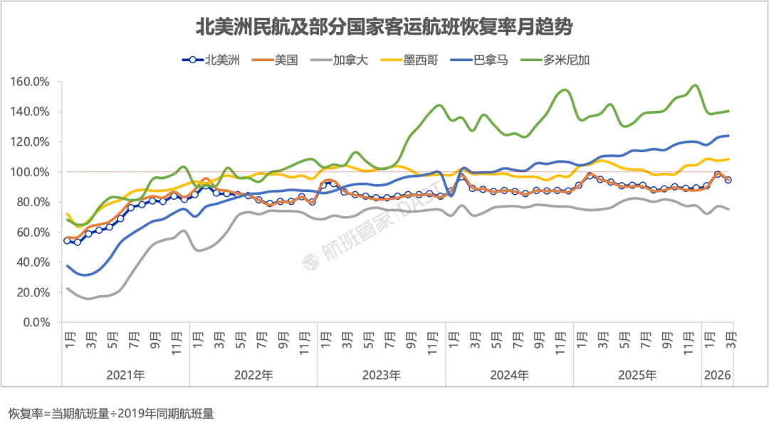 2026年3月,北美洲民航市场恢复至2019年同期的94.8%