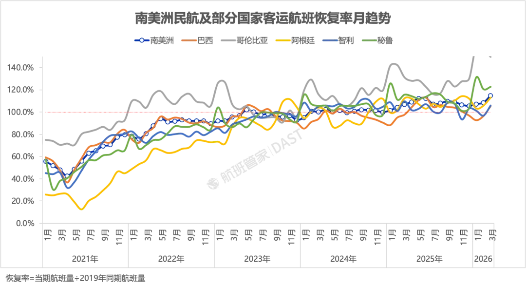 2026年3月,南美洲民航市场恢复至2019年同期的114.8%