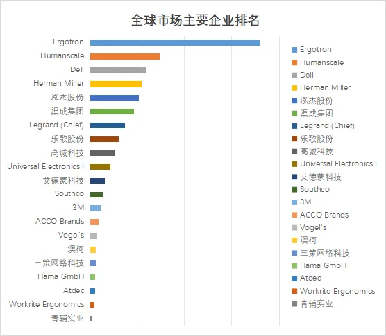 Ergotron、 Humanscale、 Herman Miller、 泓杰股份、 渠成集团、 Legrand (Chief)、 乐歌股份、 Dell、 高诚科技、 Universal Electronics Inc、 艾德蒙科技、 Southco、 3M、 ACCO Brands、 Vogel's、 澳柯、 三策网络科技、 Hama GmbH、 Atdec、 Workrite Ergonomics、 青辅实业
