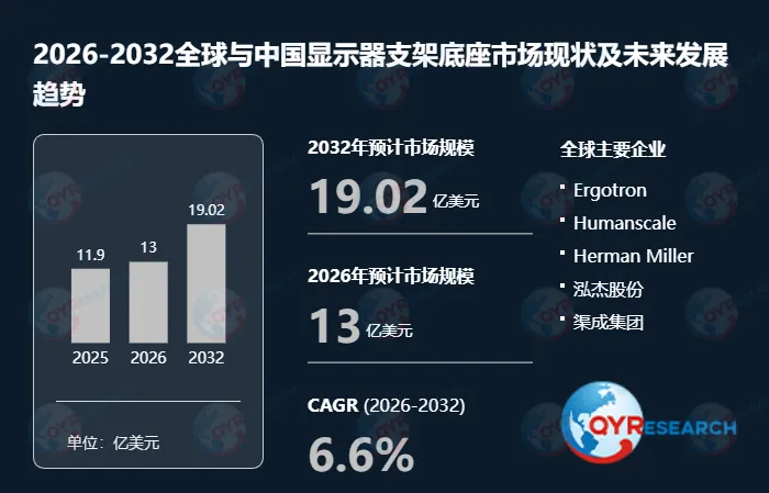 据QYResearch调研团队最新报告“2026-2032全球和中国显示器支架底座市场现状及未来发展趋势”显示,预计2032年全球显示器支架底座市场规模将达到19亿美元,未来几年年复合增长率CAGR为6.5%。