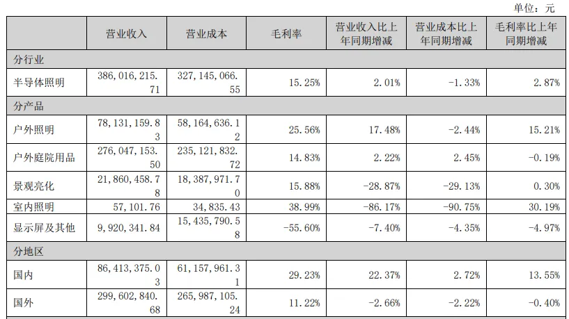 具体业务方面,报告期内,公司户外庭院用品实现收入2.76亿元,占总营收的71.52%,为第一大收入来源;户外照明收入0.78亿元,同比增长17.48%;景观亮化收入0.22亿元,同比下降28.87%。分区域看,国内市场实现收入0.86亿元,同比增长22.37%,占比提升至22.39%;海外市场实现收入3.00亿元,占比77.61%,仍占据主导地位。