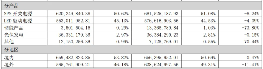 报告期内,SPS开关电源与LED驱动电源两大核心产品合计贡献超过九成营收,其中SPS开关电源实现收入6.2亿元,占比50.62%;LED驱动电源实现收入5.53亿元,占比45.13%。