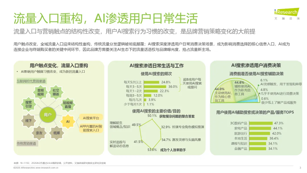 流量入口与营销触点的结构性改变,用户AI搜索行为习惯的改变,是品牌营销策略变化的大前提用户触点改变,全域流量入口迎来结构性重构,传统流量分发逻辑被彻底颠覆;AI搜索深度渗透用户日常消费决策场景,成为影响消费选择的核心信息入口,AI成为连接企业与终端购买者的关键中间环节,因此品牌方需要关注AI生态下的流量话语权与品牌曝光度,抢占流量新主场。