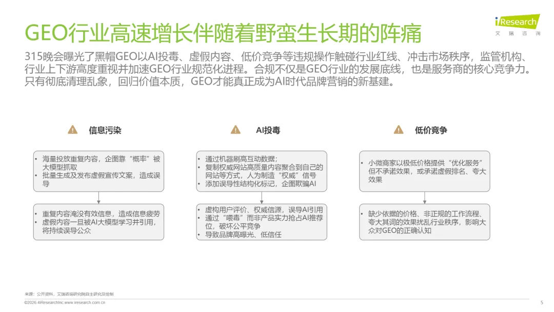 GEO(生成式引擎优化)的产生顺应了AI时代流量入口重构、用户搜索行为变化、品牌营销转型的趋势,315晚会曝光的“黑帽GEO”是行业发展初期的个别乱象,推动行业加速出清、走向规范。本文回归GEO价值本源,以长期主义视角解析GEO行业的发展潜力。