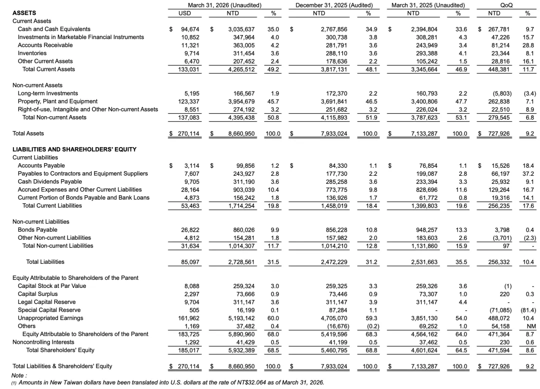 台积电2026年Q1预计实现营收约1.13万亿新台币,同比增长约35% 净利润预计达5400亿新台币以上,同比大增约50%,创历史新高 AI芯片需求爆发,3nm先进制程与先进封装产能持续供不应求 市值接近1.6–1.7万亿美元,进一步拉开与三星差距