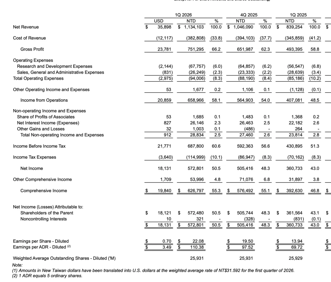 营收:1.13万亿新台币,同比+35.1% 净利润:5724亿新台币,同比+58.3% 毛利率:66.2%(历史极高水平)