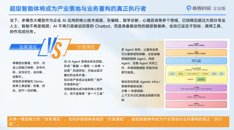 更重要的是,超级智能体(Agent)成为企业落地的核心执行单元。它们不再是被动回答的Chatbot,而是: