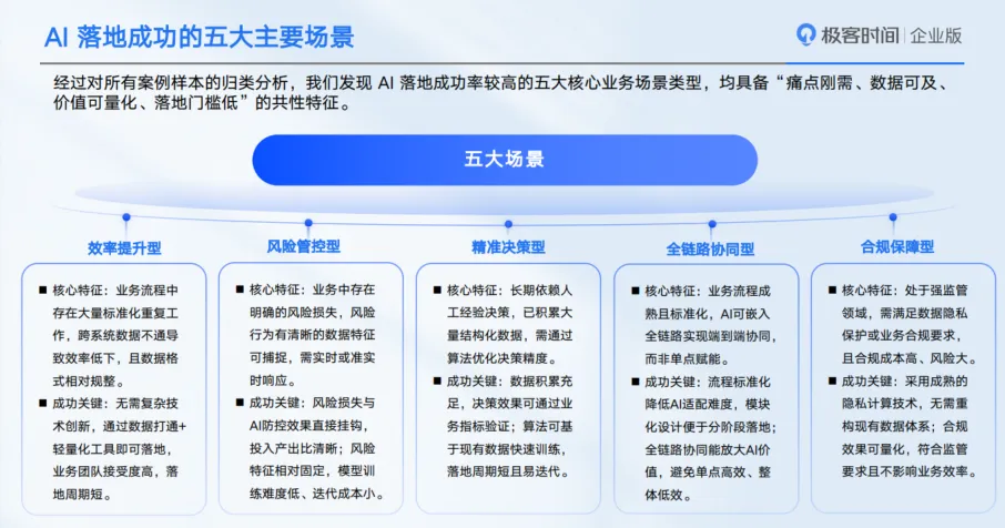 报告通过对近千个企业案例的分析,总结出AI落地成功率最高的五类场景,它们有一个共同特征:痛点刚需、数据可及、价值可量化、落地门槛低。