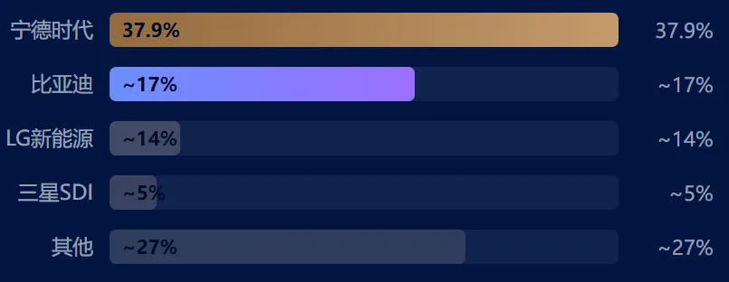 全球动力电池行业呈现一超多强格局,宁德时代以37.9%市占率居首,超出第二名比亚迪约20个百分点,行业CR2超过50%,CR5超过65%,属于寡头垄断型市场结构。