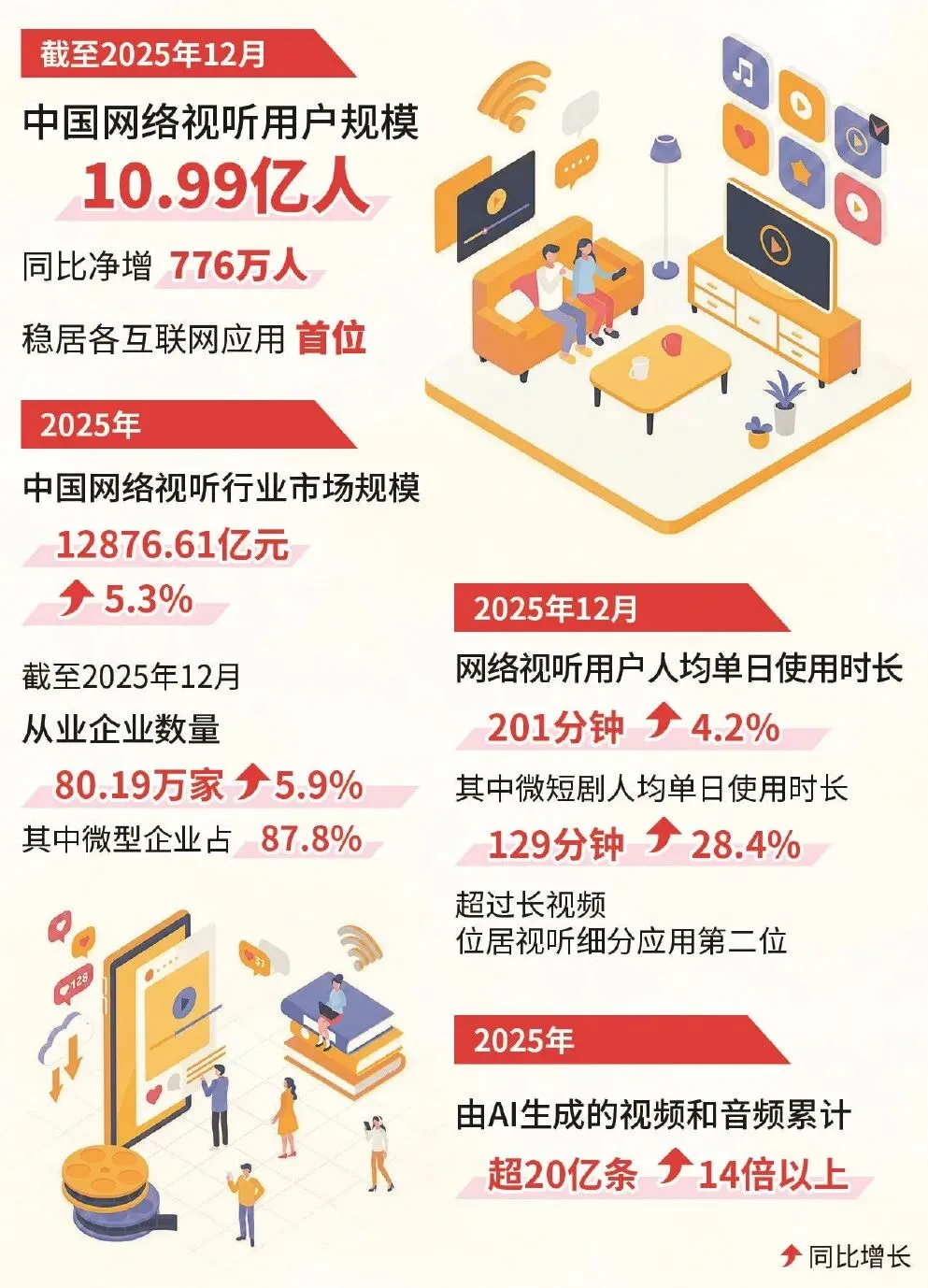 2025年12月,网络视听用户人均单日使用时长201分钟,同比增长4.2%。其中微短剧人均单日使用时长129分钟,同比增长28.4%,使用时长已超过长视频,位居视听细分应用第二位。