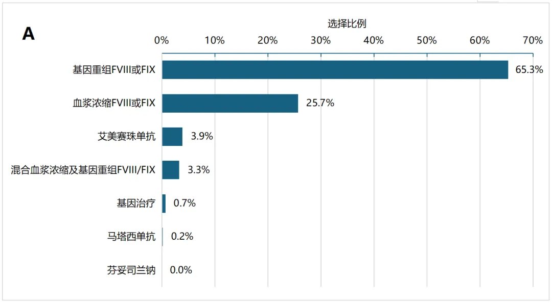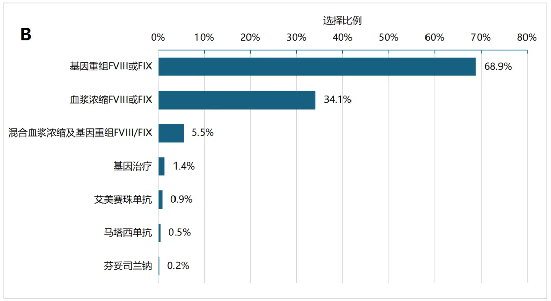 血友病作为一种X染色体连锁的隐性遗传性出血性疾病,其严重不良后果集中体现为高致残率。长期反复的关节出血可引发慢性血友病性关节病,逐步导致关节畸形、功能障碍,甚至终身残疾。既往研究显示,我国血友病患病率约 2.73/10 万,全国登记患者已达 4 万余例,由于规律替代治疗达标率偏低,30 岁以上患者残疾比例接近 90%。《血友病治疗中国指南(2025 年版)》数据显示,规律替代治疗可减少 62.0% 的年出血次数与 58.2% 的年关节出血次数,指南也明确建议所有重型及反复出血的中间型患者尽早启动规律替代治疗,已出现关节损伤者需长期维持。根据指南推荐,规律替代治疗分为凝血因子规律替代治疗以及非因子类药物治疗。目前国内上市的血友病非因子药物包括:抗 TFPI制剂(马塔西单抗)、艾美赛珠单抗以及抗AT 制剂(芬妥司兰钠)。但是目前我国治疗现状仍不容乐观,既往研究数据显示,仅 16.2% 的血友病 A 患者、10.8% 的血友病 B 患者接受规律替代治疗,绝大多数仍依赖临时止血治疗,而国际上欧美发达国家成人规律替代治疗比例均超 80%,非因子类药物更推动治疗理念从 “被动止血” 向 “主动功能保护” 转变,表明我国与国际先进水平仍存在明显差距。本次调研为横断面研究,数据来源于2026年1月至2月期间全国290家医院登记的血友病患者。经严格筛选,5,268例患者完成有效答卷,其中成年患者(≥18岁)4,131例,未成年患者(<18岁)1,137例。整体家庭经济负担较重,近九成家庭年收入不超过 10 万元,超过六成患者居住在三线及以下城市。医保方面,未成年人城乡居民医保覆盖率高达 97.7%,明显高于成年人的 63.1%。在教育及就业状况方面,成年患者本科及以上学历仅占 18.6%,仅 31.2%有稳定工作。参与医院覆盖全国30个省(自治区、直辖市),样本具有区域代表性。调研采用标准化问卷与医疗数据相结合的方式,健康状况评估使用健康评估问卷残疾指数(HAQ-DI)量表,从穿着与修饰、起身、饮食、步行、个人卫生、取物、紧握、活动八个维度评估患者日常生活功能。HAQ-DI总分范围0~3分,分数越高代表残疾程度越严重。白皮书数据显示,我国血友病患者仍以临时替代治疗为主。基因重组因子的使用比例在未成年与成年人中分别为 65.3% 和 68.9%;而非因子规律治疗(如马塔西单抗)应用比例极低,未成年人仅 3.9%,成年人更仅 0.9%,远低于欧美国家。采用临时替代治疗的未成年患者占比为59.3%,成年患者中该比例更高,达到78.8%。参照中国临床实践标准(规律替代治疗定义为:剂量≥10 IU/kg,每周≥2次,且每年持续≥45周),本研究中达到该标准的未成年患者占比为40.7%,成年患者仅为21.2%。造成这一巨大差异的核心原因之一是医保政策的覆盖不均:目前,成人血友病患者使用凝血因子进行规律替代治疗(预防治疗)尚未纳入基本医保报销范畴,而未成年患者的预防治疗则有相应的医保政策支持。加之近九成患者家庭年收入在10万元及以下,较高的自付费用显著超出了大多数患者家庭的支付能力。图1 (A)未成年患者最近1年内接受治疗的情况. (B)成年患者最近1年内接受治疗的情况.