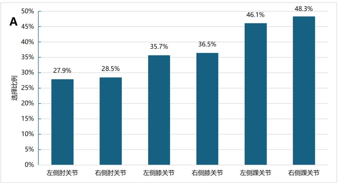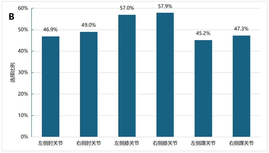 高频出血现象在临时治疗群体中极为普遍。在接受临时替代治疗的患者中,年均治疗次数超过50次的未成年患者占48.1%,成年患者占40.9%。出血部位表现出明显的年龄差异:未成年患者双侧踝关节受累最为突出,右踝与左踝出血发生率分别为48.3%和46.1%;成年患者双侧膝关节受累最为严重,发生率分别为57.9%和57.0%。图2(A)未成年患者经常出血关节的部位情况. (B)成年患者经常出血关节的部位情况.