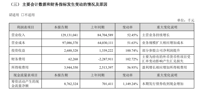 财报显示,公司一季度营业收入达到1291.31亿元,同比猛增52.45%,刷新历史单季纪录;归母净利润高达207.38亿元,同比增长48.52%,一举超过了此前市场预期的上沿。