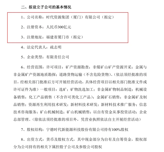 财报披露当日,宁德时代同步公告拟投资300亿元设立全资子公司“时代资源集团(厦门)有限公司”,定位为公司新能源矿产领域的专业投资运营与管理平台。该公司将以货币及股权方式出资,整合现有矿业相关资产,拓展海内外优质矿产资源项目。